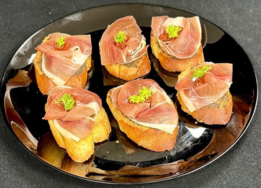 Bruschetta de jamón serrano con tapenade y tomates asados en finas hierbas.