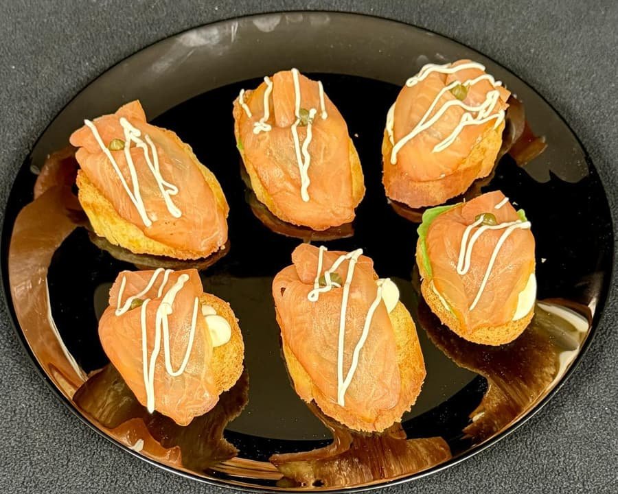 Bruschettas de salmon, queso crema y alcaparras.