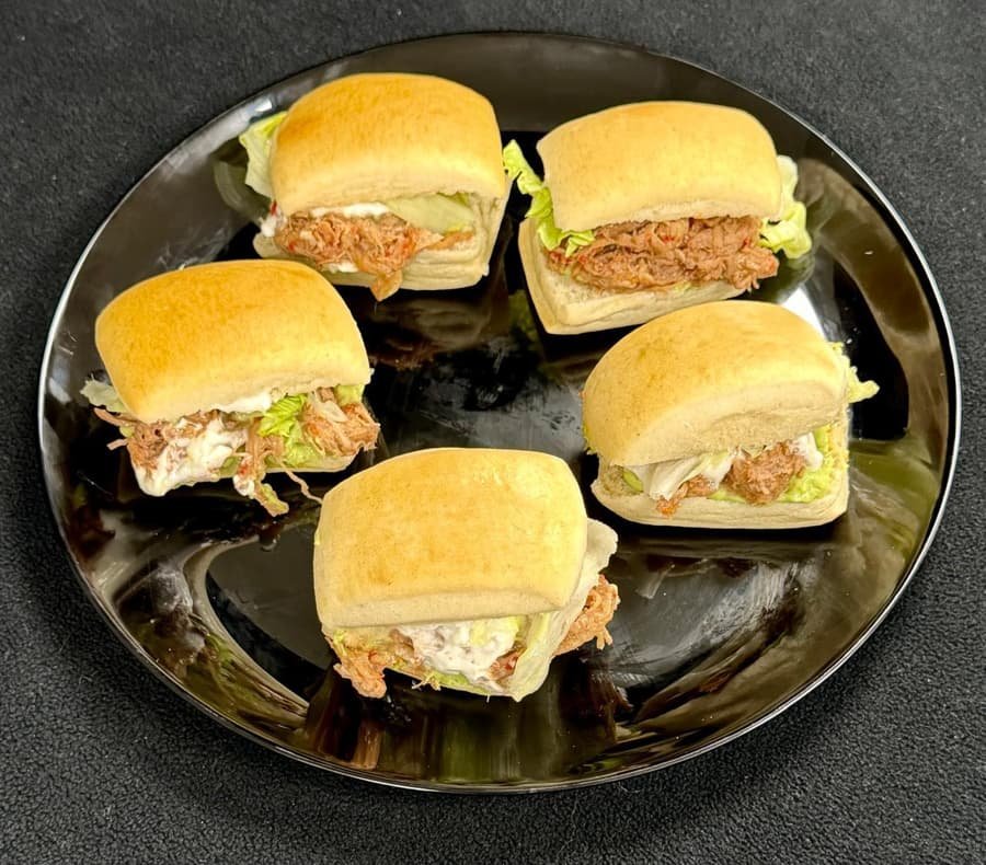 Tapaditos en pan campestre con carne mechada, guacamole, lechuga y mayonesa.
